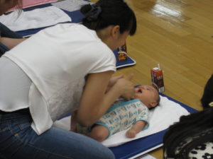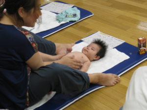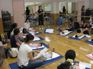 お母さんが赤ちゃんにとって心地よい運動を通して、赤ちゃんとの接し方、遊び方を学びます。