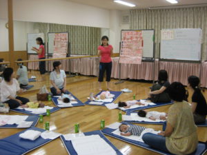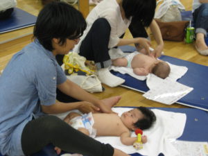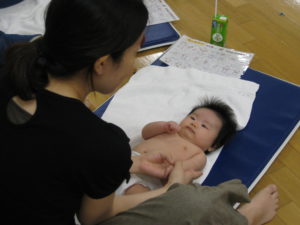 お母さんが赤ちゃんにとって心地よい運動を通して、赤ちゃんとの接し方、遊び方を学びます。