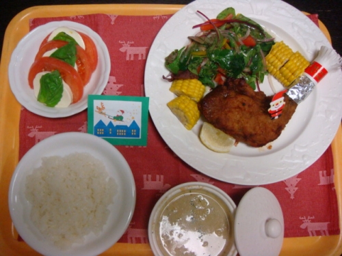クリスマスイヴです♪クリニックでもクリスマスメニューを患者様に提供しています。定番の鳥の太もも、前菜にはモッツァレラチーズと新鮮トマトをあしらってみました♪。3時のおやつにはお手製ケーキも登場します。